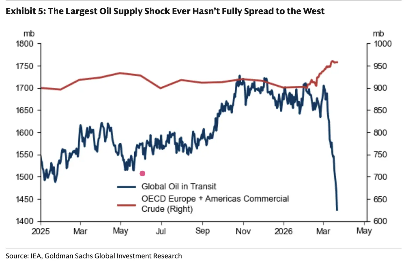 目前,全球「在途原油」的蒸发效应尚未真正传导至陆上库存。但我们的判断是,到 4 月中旬,这一影响将全面显现。