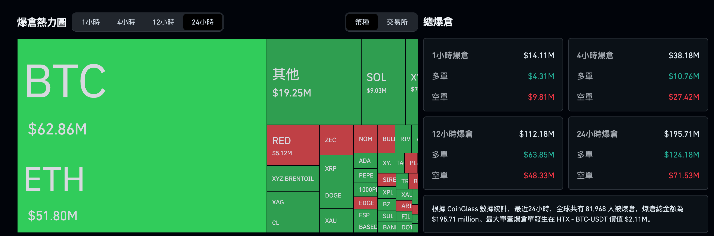 然而,劇烈的價格波動也讓合約市場的雙邊交易者付出慘痛代價。根據 CoinGlass 截至 4 月 8 日凌晨 4 時的即時數據統計,過去 24 小時內,全球共有 81,982 名投資者慘遭爆倉,全網爆倉總金額高達 1.95 億美元(約 195.72 million)。其中,最大單筆爆倉單發生在 HTX 交易所的 BTC-USDT 交易對,該筆清算價值達 211 萬美元。
