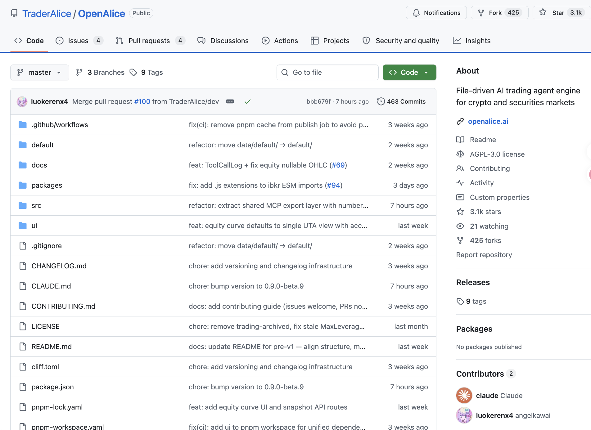 目前 OpenAlice 在 GitHub 上有 3100 多 star,425 個 fork,463 次提交。