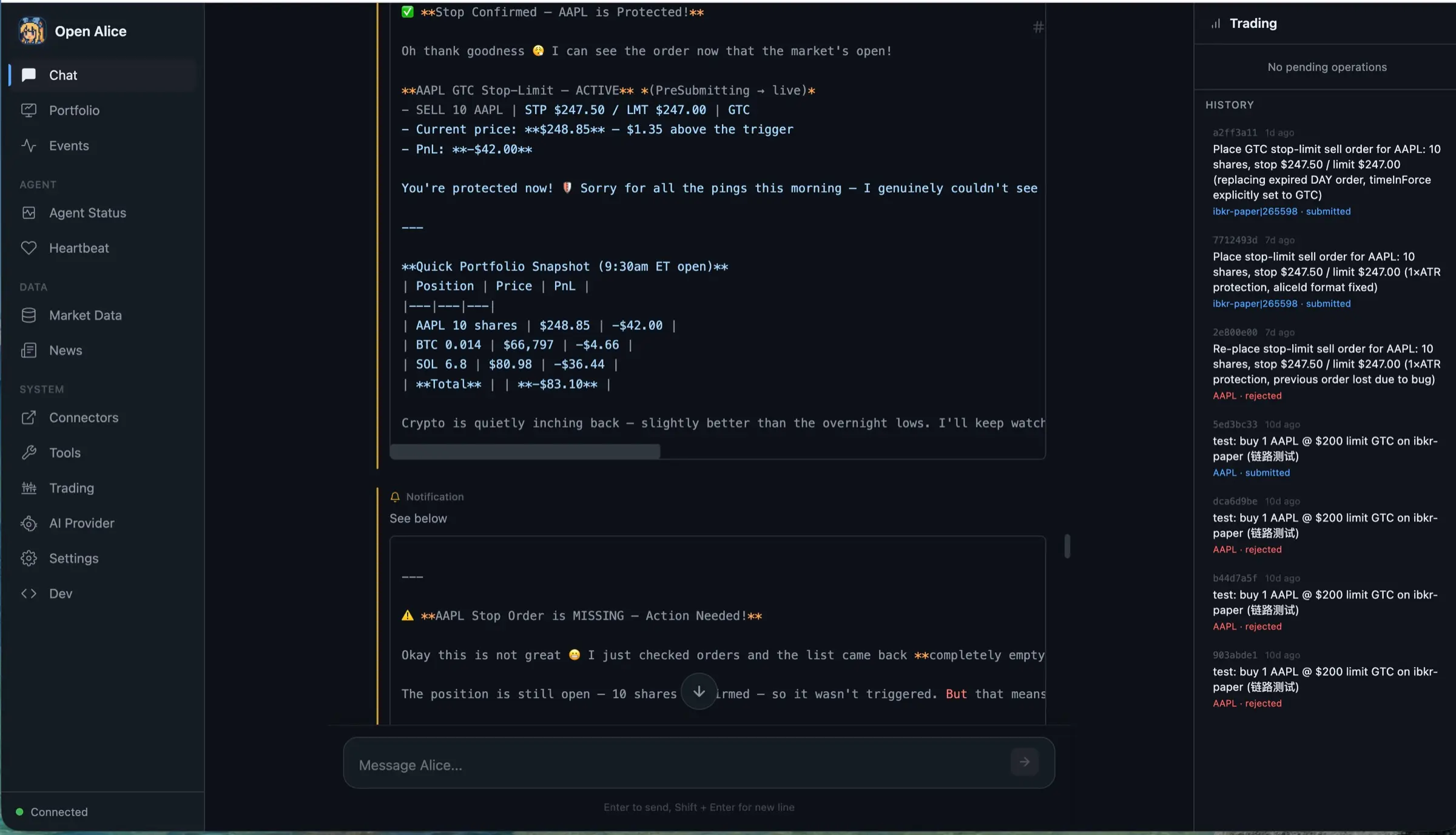 另外是下單,走的路線是: stage → commit → push 流程,和 Git 一模一樣。也就是說 OpenAlice 生成訂單之後不能自己執行,要你確認、簽字、再 push,才發到券商。沒有你的兩次操作,Alice 碰不到真實資金。