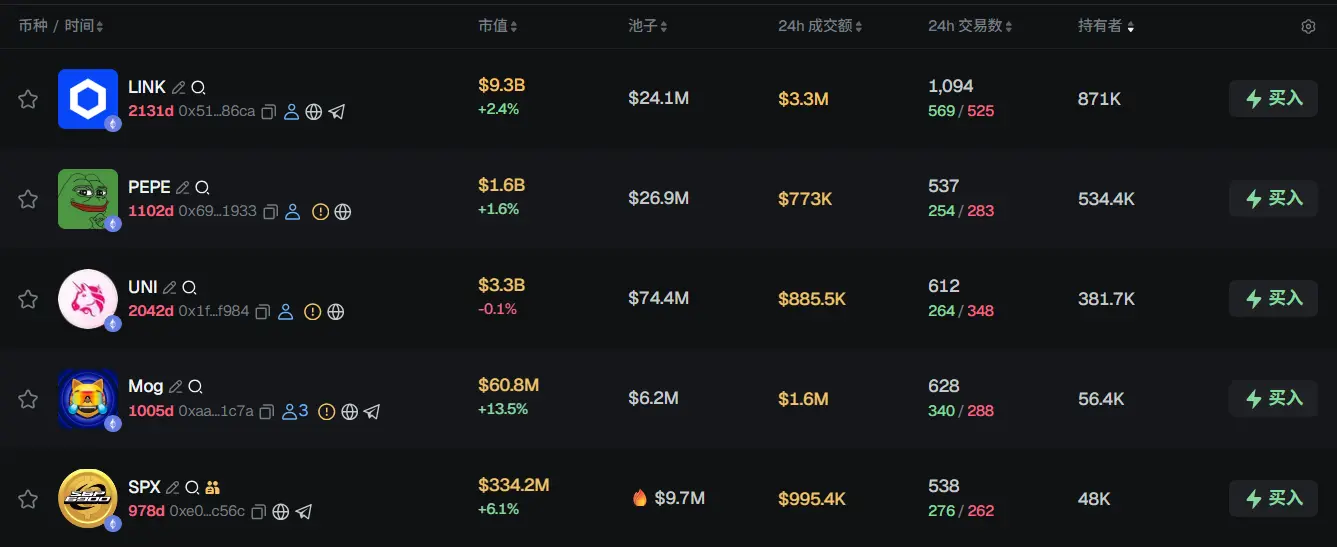 过去 24h ETH 热门代币前五依次为:LINKPEPE、UNI、Mog、SPX