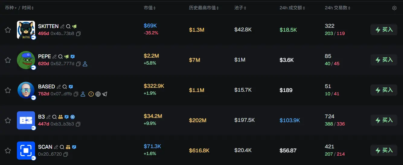 过去 24h Base 热门代币前五依次为:SKITTEN、PEPE、BASED、B3、SCAN