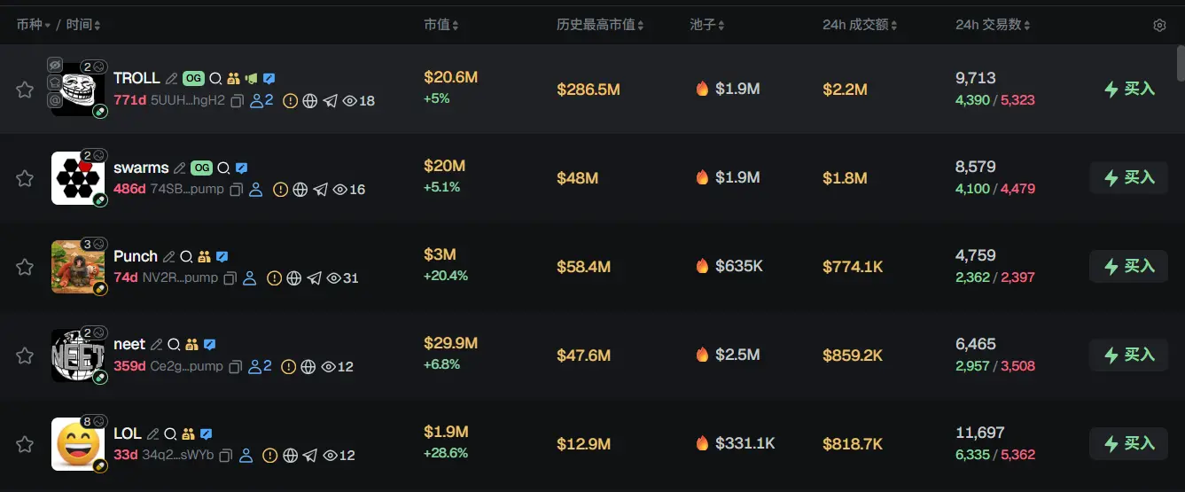 过去 24h Solana 热门代币前五依次为:TROLL、swarms、Punch、neet、LOL